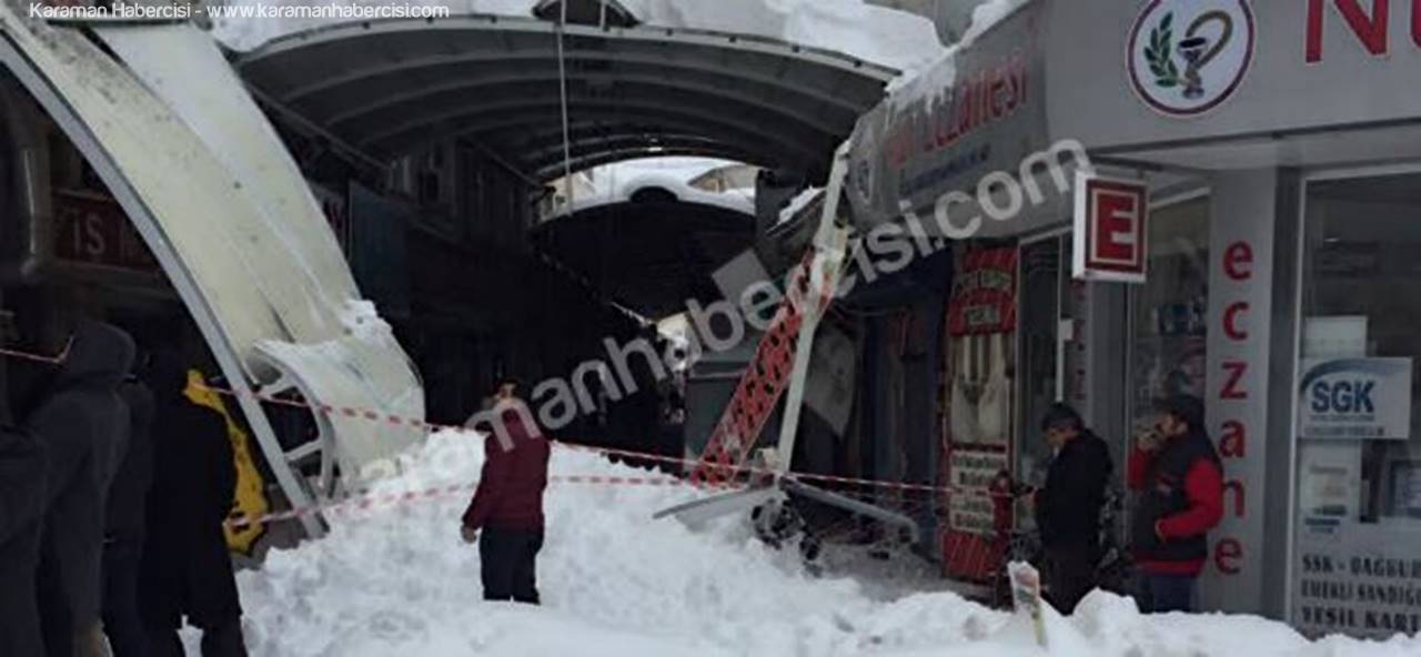 Karaman’da bu sabah Gazi Paşa Bedesteninde yer alan ayakkabıcılar ve tuhafiyeciler sokağındaki işyerleri çatısını kaplayan alan yoğun kar yağışı sebebiyle çöktü.