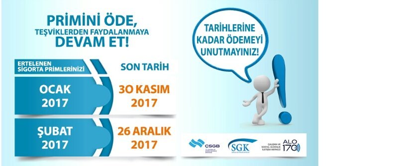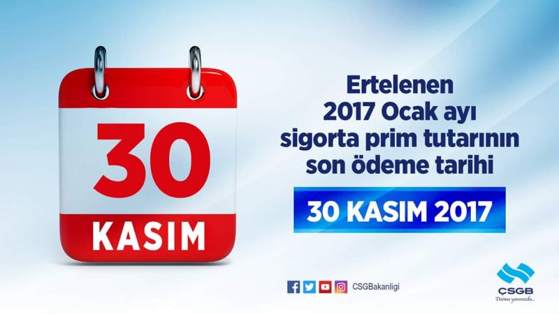 Ertelenen sigorta primlerinin ikincisinin ödeme süresi gelmiştir. Bu nedenle, 2017 yılı Ocak ayına ait sigorta primlerinin 2017 yılı Kasım ayı sonuna (30 Kasım 2017) kadar ödenmesi gerekmektedir.
