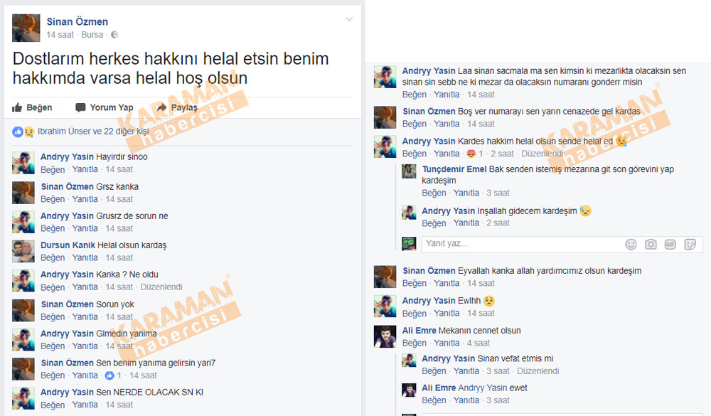 Yakınlarını üzüntüye boğan olay 04.00 sıralarında Ermenek Elmayurdu Köyü'nde meydana geldi. Annesiyle birlikte yaşadığı öğrenilen ve çiftçilik yaptığı öğrenilen Sinan Özmen, sosyal paylaşım sitesindeki hesabından arkadaşlarına 'Dostlarım herkes hakkı helal etsin, benim hakkımda varsa helali hoş olsun' mesajı yazdı.