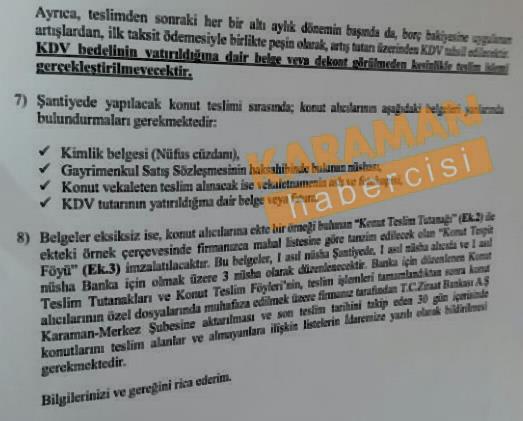 3. KDV tutarının (yaklaşık 1.250,00-TL) T.C.Ziraat Bankası A.Ş Karaman-Merkez Şubesine yatırıldığına dair belge veya dekont.( KDV bedelinin yatırıldığına dair belge veya dekont görülmeden kesinlikle teslim işlemi gerçekleştirilmeyecektir)