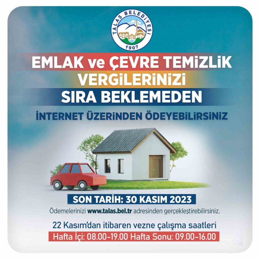 Talas Belediyesi'nde "Emlak ve Çevre Temizlik" vergilerinin 2. taksit ödemeleri devam ediyor.