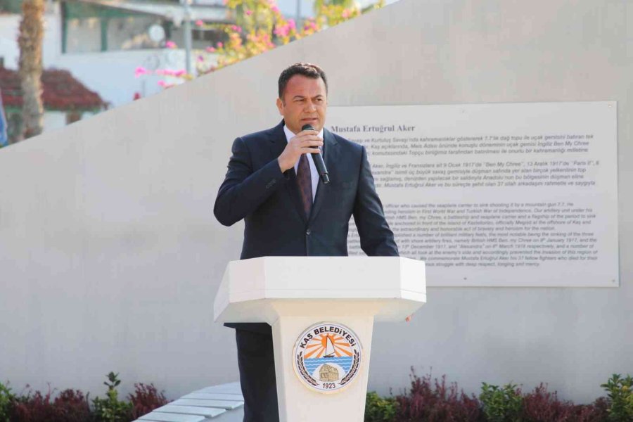 Kaş Kaymakamlığı ve Kaş Belediyesi tarafından, "Kaş'ın Kahramanları Anıtı" önünde anma töreni düzenlendi. Kaymakam Murat Öztürk, törende yaptığı konuşmada, tarihin çağlar boyunca unutmadığı kahramanların, her daim azim ve cesaret göstererek zihinlerde yerini aldığını söyledi. Cesaret örneği olan Topçu Yüzbaşı Mustafa Ertuğrul Aker ve silah arkadaşlarının kahramanlıklarını tüm dünyaya kanıtladığını belirten Kaymakam Öztürk, "İngiliz Ben My Chree'yi Liman Ağzı mevkiinde sulara gömen bu kahraman Türk askerlerini anmak, bu vatan evlatlarının atalarına karşı borcudur. Mustafa Ertuğrul Aker'in deyimiyle "Türk'ün 12 mükemmel yumruğu, 12 top atışıyla dünyaya Türk'ün gücünü göstermiştir'. Mustafa Ertuğrul Aker, bununla da yetinmemiş, onca açlığa, salgın, hastalığa rağmen gücünü iki ay içinde yeniden toplayarak, Paris II ve Alexandra gemilerini Akdeniz'in derin sularına gömmüştür. Uzun yıllar saklı kalan bu kahramanı bizlere tanıtan ve bugün burada toplanmamızı sağlayan herkese teşekkürlerimi sunarım. Zeka ve başarı örneği olan, bu savunma ve direnişi gerçekleştiren Topçu Yüzbaşı Mustafa Ertuğrul Aker ve silah arkadaşları başta olmak üzere tüm şehitlerimizi ve ebediyete irtihal eden gazilerimizi rahmetle anıyorum. 1917 yılında Kaş ilçesinde başlayan bu mücadelenin tanıkları, şimdi Akdeniz'in derin maviliklerinde yatıyor. Bugün burada Türk'ün zaferlerini haykırabiliyorsak bu kahraman askerler sayesindedir. Şehitlerimizin ruhları şad olsun" dedi.
