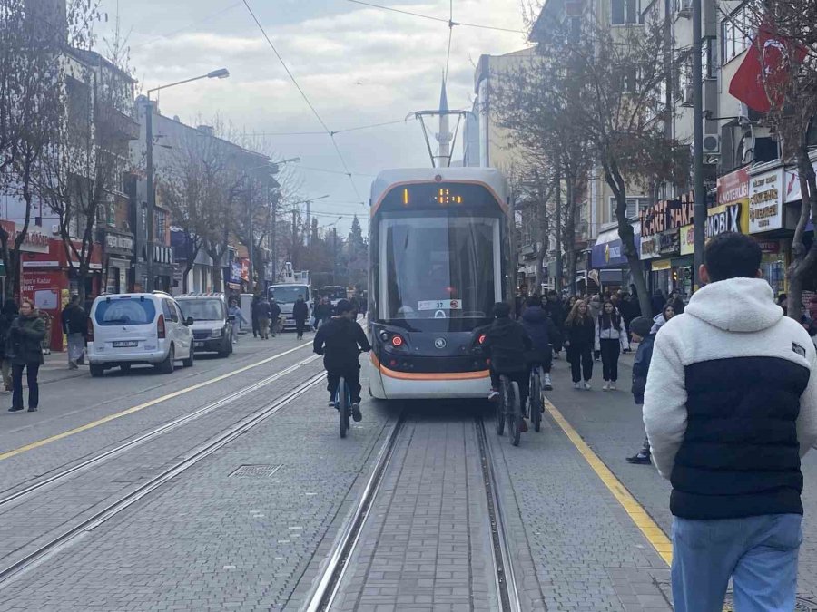 İki Eylül Caddesi üzerinde bir tramvayın arkasına tutunarak seyreden 3 bisikletli çocuk dikkat çekti. Yaşı küçük çocukların hareket halinde olan tramvayın peşinden giderken bisikletleriyle ön kaldırdıkları ve tehlikeli manevralar yaptığı görüldü. Muhtemel bir kaza yaşanmasından endişelenen çevredeki vatandaşlar çocukların düşüncesiz hareketlerine tepki gösterdi.
