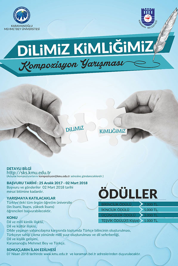 Karamanoğlu Mehmetbey Üniversitesi (KMÜ) ve Karaman Belediyesi tarafından üniversite öğrencilerine yönelik ‘Dilimiz Kimliğimiz' konulu kompozisyon yarışması düzenlenecek.