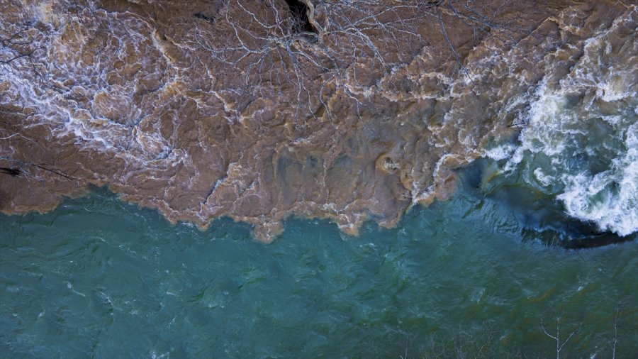 Sağanakların ardından debisi artan ırmakta, temiz su ile dağlardan gelen çamurlu sel suyunun buluşması farklı bir görüntü oluşturuyor.