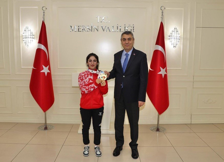 Mersinli milli sporcu Gamze Altun, Moldova'nın başkenti Kişinev'de düzenlenen 2025 Avrupa Halter Şampiyonası'nda silkmede 93 kiloyla altın madalya, toplamda 161 kiloyla Avrupa 3'üncülüğünü elde etti. Vali Atilla Toros, ziyaretine gelen Avrupa şampiyonu Mersinli Milli Halterci Gamze Altun ile görüştü. Vali Toros, Türkiye'yi uluslararası arenada başarıyla temsil eden ve Avrupa şampiyonluğuyla gençlere örnek olan milli halterciye başarılarının devamını diledi.