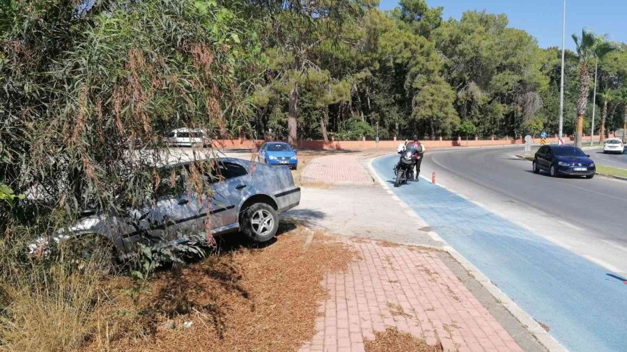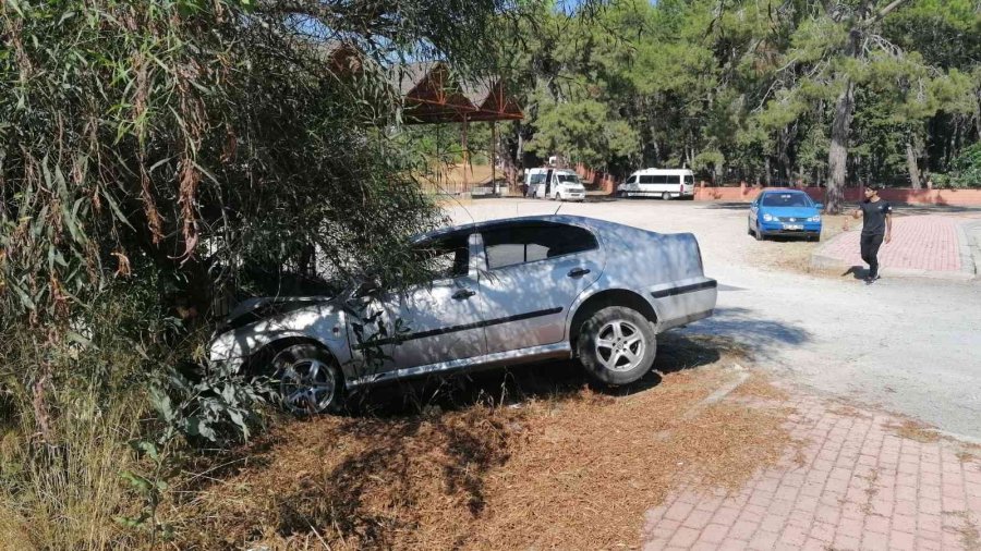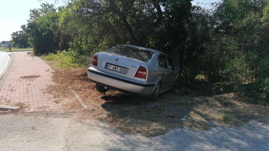 Antalya'nın Manavgat ilçesinde virajı alamayan otomobil bahçe kapısında bulunan ağaca çarparak durabildi.
