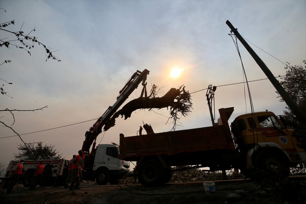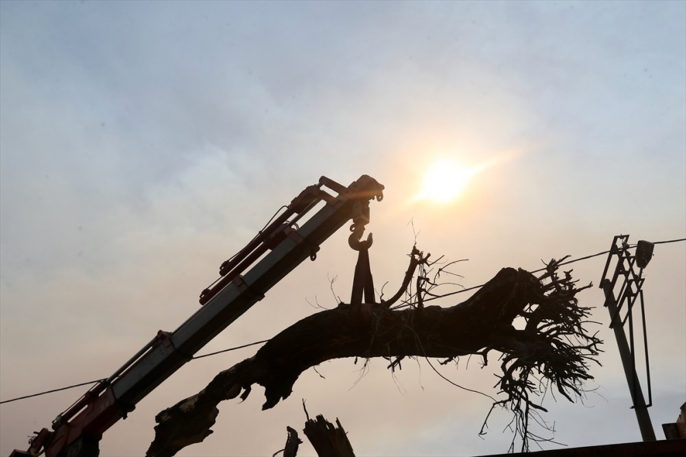 Kepez Belediyesi ekipleri de yangında zarar gören asırlık zeytin ağaçlarını bulundukları yerden vinç yardımıyla alarak müzede sergilemek için korunaklı bölgelere taşıyor.