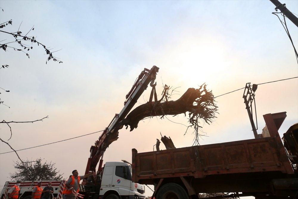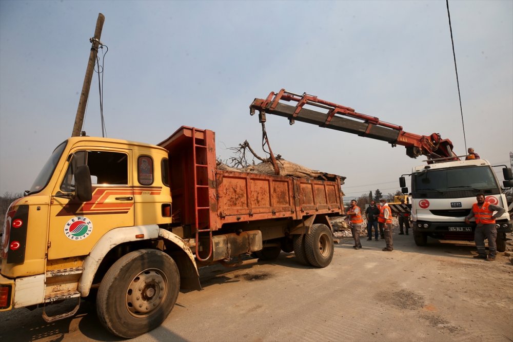 Kalemler Mahallesi'nde asırlık ağaçların zarar gördüğünü belirten Mert, yanan asırlık zeytin ağaçlarının belediye ekiplerince vinç yardımıyla sökülerek kamyonlara yüklendiğini anlattı.