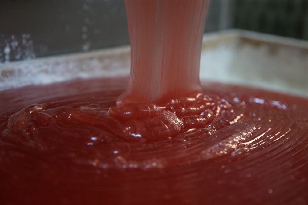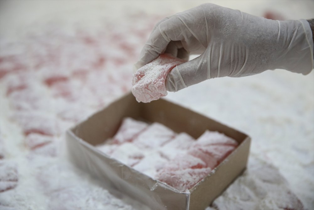 Lokum için şeker, nişasta, su ve limon tuzu karıştırılarak, kazanlarda 1,5 saat kaynatılıyor. Kıvamına gelen malzeme, tahta kasalara dökülerek soğuması bekleniyor. Üçgen şeklinde dilimlenen lokumlar, paketlenerek satışa sunuluyor.