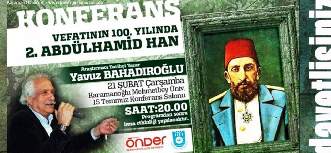 Karaman Belediyesi ve ÖNDER (İmam Hatipliler Derneği), Vefatının 100. Yılında 2. Abdulhamid Han konulu konferans düzenliyor.