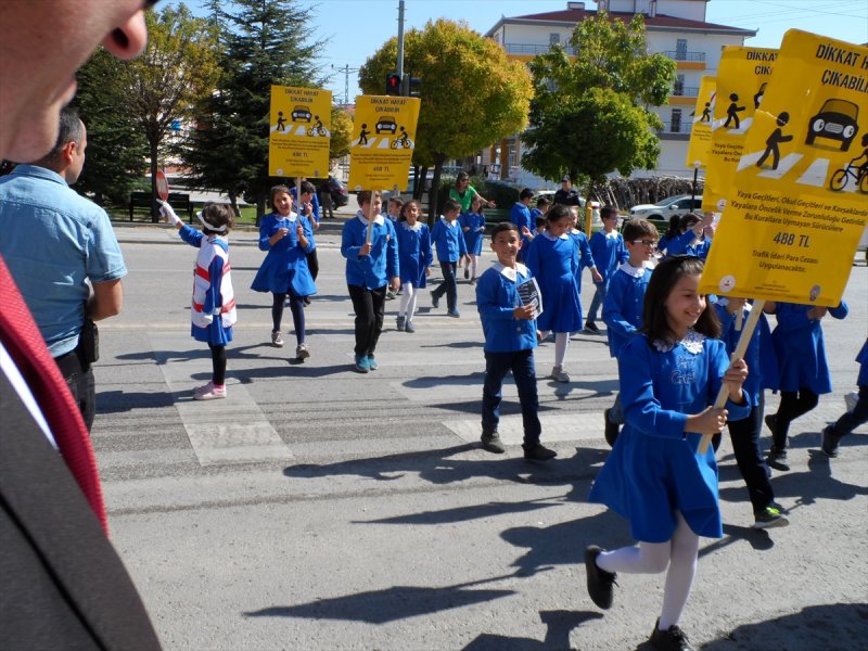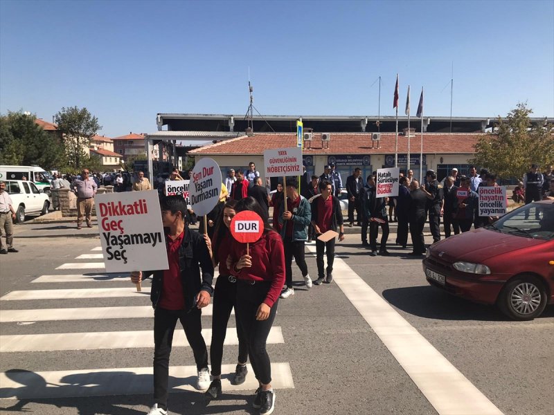 Trafikte yaya önceliği bilincinin oluşturulması amacıyla hayata geçirilen uygulamaya Kaymakam Engin Aksakal, İlçe Emniyet Müdürü Tarık Esat, İlçe Milli Eğitim Müdürü Kemal Yıldırım ve öğrenciler katıldı.