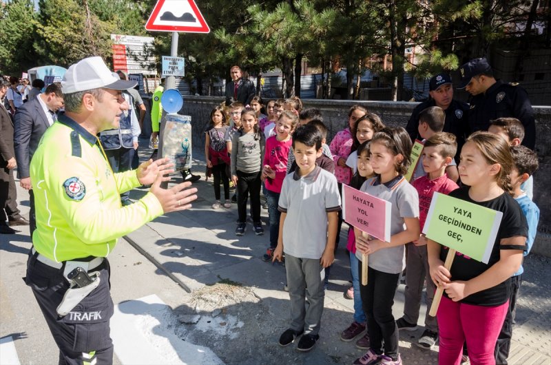 Ellerinde "yaya geçidi kullan, yaya öncelikli trafik, öncelik yayanın, hayata yol ver" yazılı dövizler taşıyan öğrencilere yaya geçidi kuralları uygulamalı olarak gösterildi.