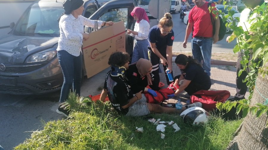Antalya'nın Manavgat ilçesinde hafif ticari araç ile motosikletin çarpışması sonucu meydana gelen kazada motosiklet sürücüsü yaralandı. Yaralanan ve refüjdeki çimlerin üzerine düşen yaralı motosiklet sürücüsünü, çevredeki vatandaşlar ellerindeki kartonla güneşten korunmaya çalışıldı.